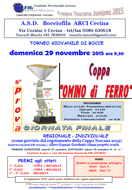 Domenica 29 a Cecina si svolgerà la finale Coppa Toscana Juniores, l’ottava ed ultima prova denominata “Coppa omino di ferro“. Tanti i verdetti già emessi come la vittoria di Jean Paul Pacini nella categoria Under 18 e di Andrea Rosella fra gli Esordienti. Ancora aperta la classifica per gli Under 15 con in testa Riccardo Mazzoni seguito a breve distanza dal fratello Riccardo e da Giacomo Cecchi. Sarà proprio la “Coppa Omino di Ferro” di Cecina a decidere la classifica definitiva per l’assegnazione del titolo 2015. Fra le società sembra netto il vantaggio di Cortona bocce che è ad un passo dalla conquista della sua seconda “Coppa Toscana Juniores” dopo quella vinta nel 2012.