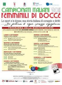 Scaricate la locandina in formato .pdf della settimana di incontri, eventi, libri concerti e sport in programma per i Campionati Italiani Femminili di Bocce specialità Raffa al bocciodromo di Sesto Fiorentino dal 5 all’11 settembre. Cliccate qui: Campionati Italiani Femminili Locandina