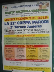 Domenica 12 Agosto dalle ore 9.30 la Società Bocciofila Viareggina (Pineta di Ponente, Via Cadorna Fratti) organizza, con Direttore di gara il signor Alfonso Ruggiero di Pistoia, l’edizione numero 52 della Coppa Parodi – 2° Torneo Juniores, gara regionale giovanile individuale riservata alle Cat. Under 23, Allievi, Ragazzi e Esordienti.